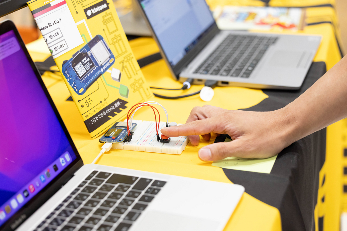 このIoTのデモでは、ユーザが物理的なボタンを押下することによりkintoneにデータが登録され、ブラウザの自動更新で瞬時に表示しているレコード一覧にデータが反映されるという内容を紹介しました。Obnizはクラウドにコードを保管しており、kintoneからもそのコードを参照していました。これにより、ボタン押下によるイベントの発火が可能になり、その場でボタンとkintoneが連携していることがすぐに体感出来ます。