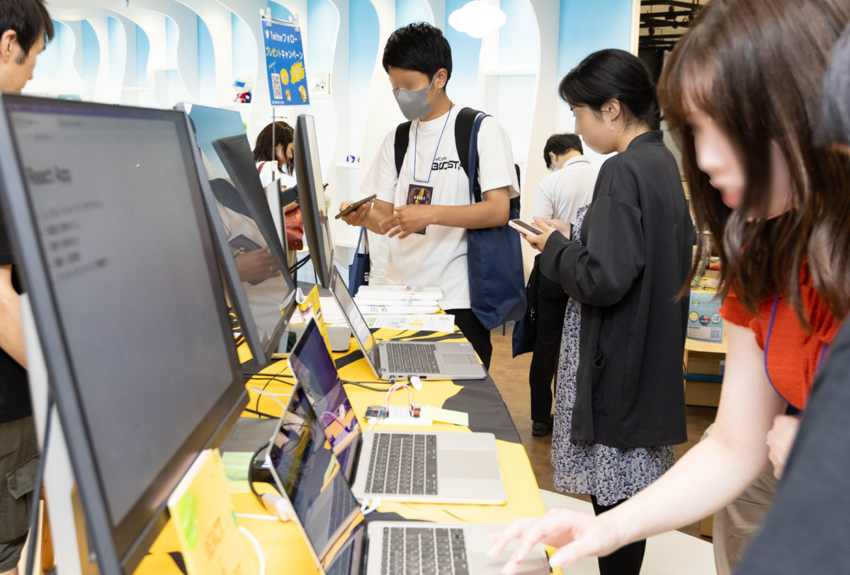 すぐに触って体験出来るデモを、来場者の方々に触って頂きました。Obnizのデモはボタンを押下すればすぐに結果が出る仕組みだったので、分かりやすくて人気でした。触れるデモって良いですね!