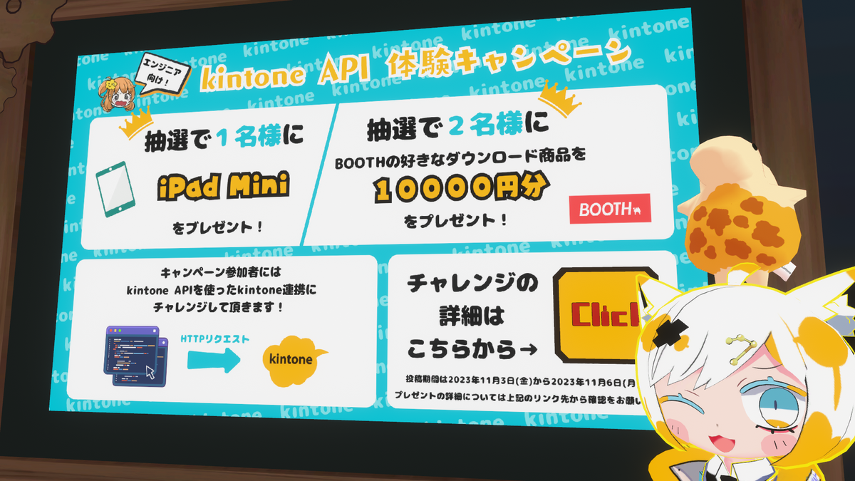 先日行われたメタフェス2023で、kintoneブースではエンジニア向けに『kintone API体験キャンペーン』を開催しました。いくつかのタスクにチャレンジしてフォームに答えを入力することで、正解者には抽選でiPad Mini (1名) 又は BOOTHの好きな商品が10,000円分 (2名) が当たるキャンペーンを実施しました。