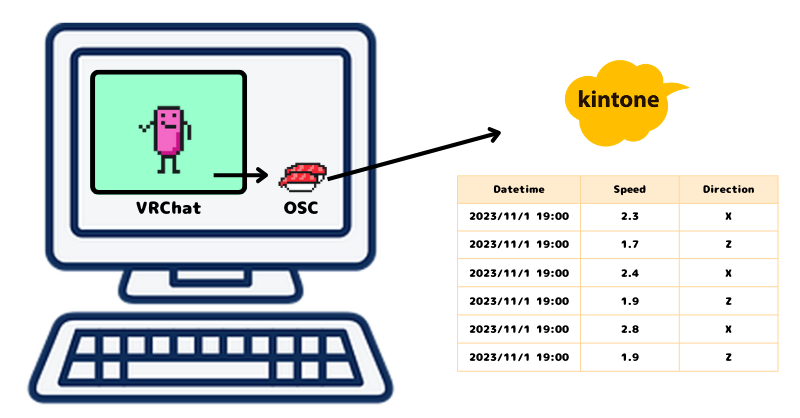 DenShoGumaさんはOSC(オスシ)を使い、VRChat内のアバターの座標データをリアルタイムでkintoneに登録する連携を作ってくれました。
