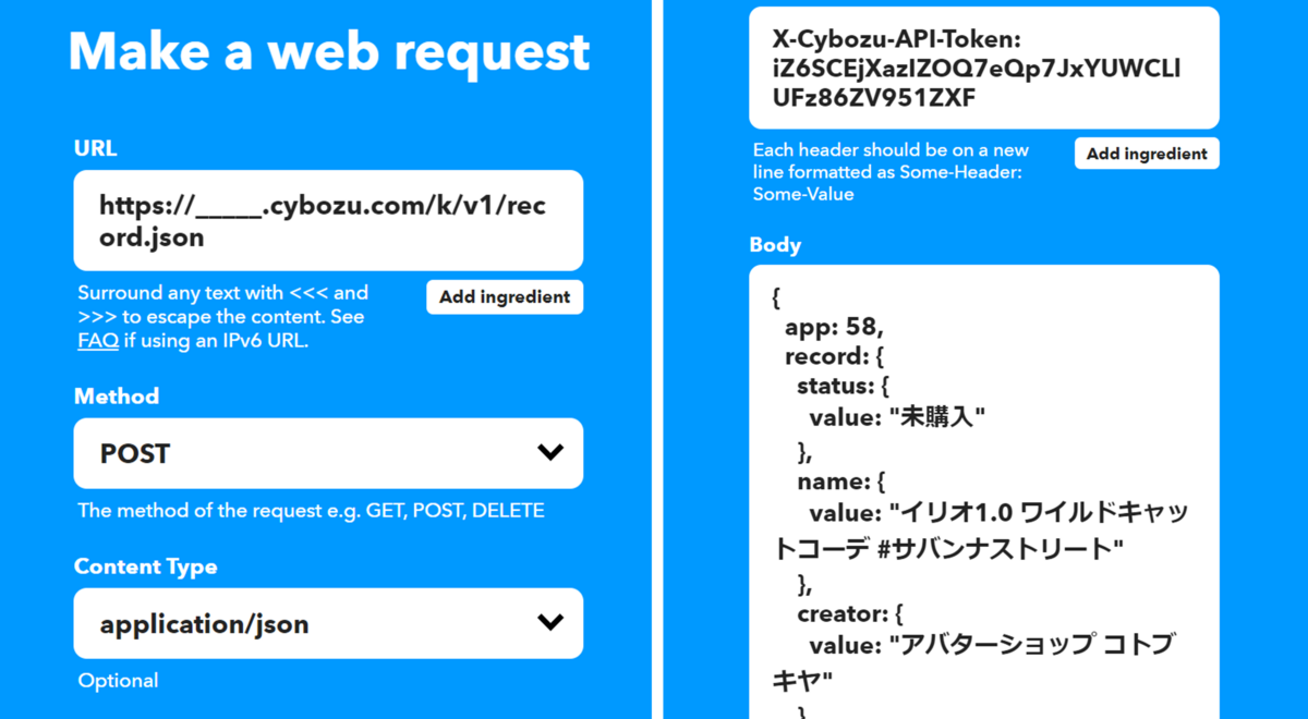 import requests url = "https://{サブドメイン名}.cybozu.com/k/v1/record.json" headers = { "Content-Type": "application/json", "X-Cybozu-API-Token": "iZ6SCEjXazIZOQ7eQp7JxYUWCLlUFz86ZV951ZXF", } data = { "app": 58, "record": { "status": { "value": "未購入" }, "name": { "value": "イリオ1.0 ワイルドキャットコーデ #サバンナストリート" }, "creator": { "value": "アバターショップ コトブキヤ" }, "price": { "value": 6000 }, "type": { "value": "VRアバター" }, "link": { "value": "https://avatarchan.booth.pm/items/3188683" }, } } response = requests.post(url, headers=headers, json=data) print(response.status_code) print(response.json())