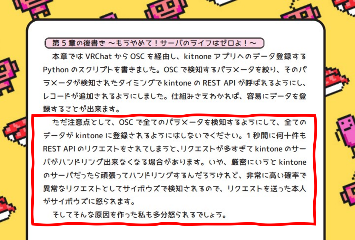 ただ、リアルタイムのデータはkintoneを介さなくても、別の手段でハンドリングしても良いかなと思っています。というのも、kintoneアプリに溜まるデータは、その後『人間が確認して処理を行う』といったデータの活用方法が実用的だからです。また、以下、BOOTHで好評発売中のVRChat x kintone の技術本 から一部抜粋します。