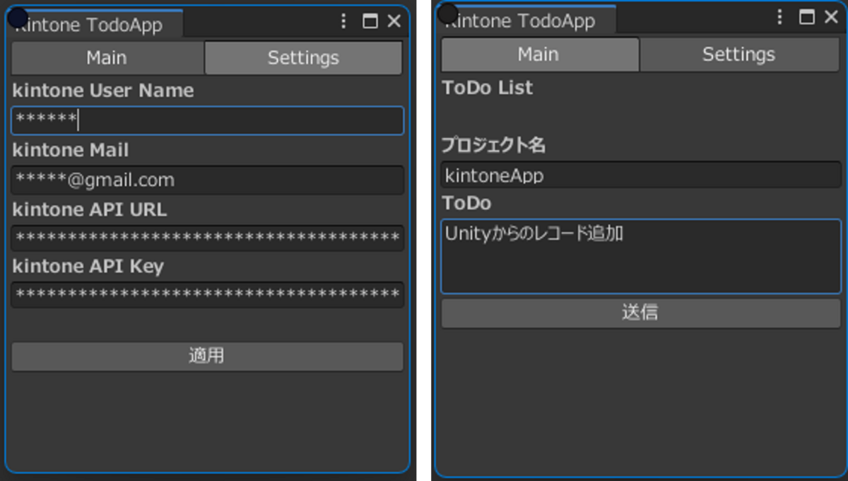 ツール上ではkintone環境の設定を入れることが出来ます。Unityの作業中、ふとToDoを思いついたら、Unityから離れずkintoneアプリにToDoを登録出来るところが魅力的でした。