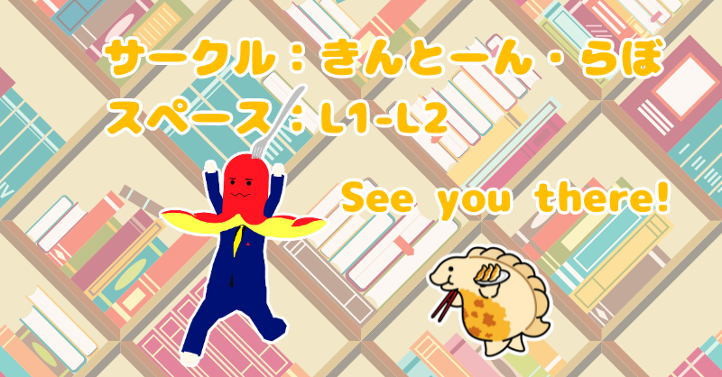 L1-L2スペースにて、「きんとーん・らぼ」というサークル名で出展をします。大きな黄色いクロスを被せるので、遠くからでも見つけやすいです!