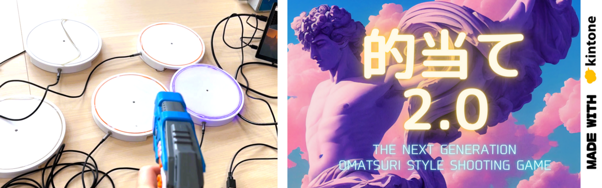 縁日の射的をIoTで再現した作品です。時間内に、赤外線の銃でいくつ的に当てられるかを競うゲームです。得点は自動的にkintoneに登録されてランキングに表示されます。